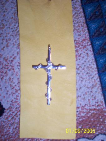 This a cross is 12ga. square sterling wire with 22 ga. twisted sterling wire "rope". Approx. 2.5" long It sold for $50.00